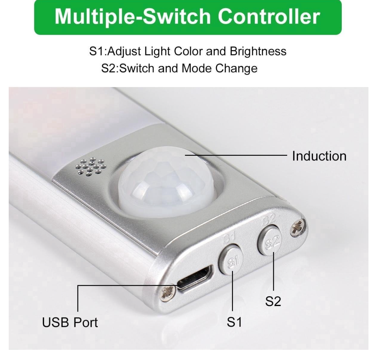 Knop S2: kort indrukken = continu aan (geen lampje), op beweging (rood lampje knippert), op beweging mits donker (groen lampje knippert).